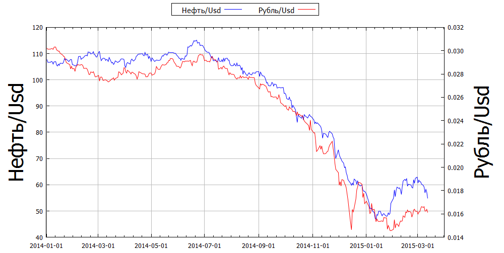 Россия сделана из нефти. Нет, правда. Курс рубля довольно тесно связан с ценой нефти, зависимость линейная (для курса Rub/Usd), коэффициент детерминации ~0,97.