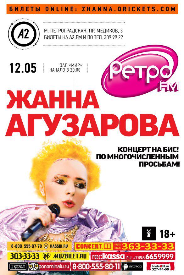 а 15 мая Жанна Агузарова дает концерт в Москве!http... Билеты на концерт Жанна Агузарова без наценки по официальной цене можно забронировать и купить на сайте Билетмаркет.ру и по телефону +7(495)739-55-99.