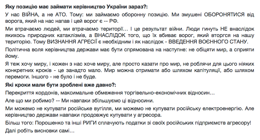Вони вимагають ввести воєнний стан, прийняти закони про недоторканність депутатів, Вони вимагають ввести воєнний стан, прийняти закони про недоторканність депутатів, суддів і т.д., а також відправити у відставку все військове керівництво країни і залучити до формування нового представників воюючих батальйонів.