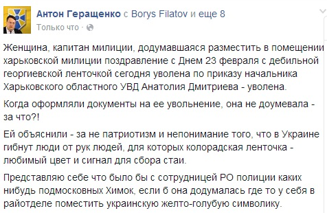 В Харькове за поздравление с 23 февраля с символикой оккупантов уволен сотрудник В Харькове за поздравление с 23 февраля с символикой оккупантов уволен сотрудник милиции, — Антон Геращенко Цензор21:450 2 Народный депутат Украины Антон Геращенко поделился информацией о том, что сегодня в Харькове была уволена сотрудник милиции, разместившая поздравление с 23 февраля вместе с гео…