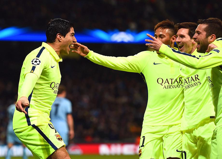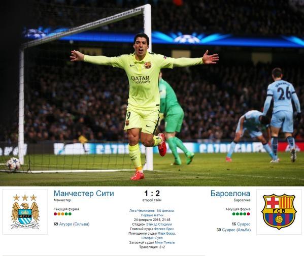 Дубль Суареса принес «Барселоне» победу над «Манчестер Сити» В первом матче 1/8 финала Лиги чемпионов Барселона выиграла в гостях у Манчестер Сити со счетом 2:1. Оба гола в составе каталонцев провел Луис Суарес, для которого этот дубль стал первым за сине-гранатовых после перехода из Ливерпуля .